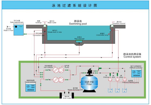 游泳池水質處理系統遵從動態平衡工作原理,在循環處理過程中達到水質的徹底凈化。游泳池水經上溢流水道收集后匯集到平衡水池,會同補充水一起進入循環水管線...