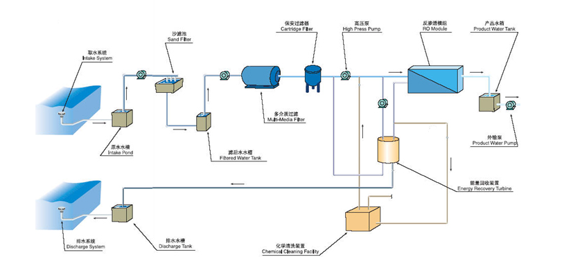 海水淡化設(shè)備工藝給水預(yù)處理是保證反滲透系統(tǒng)能夠長期穩(wěn)定運行的關(guān)鍵,在制定海水預(yù)處理方案時應(yīng)充分考慮到海水中存在大量微生物、細(xì)菌和藻類等雜質(zhì)。微生物的生長不僅會給取水設(shè)施帶來許多麻煩,而且會直接影響海水淡化設(shè)備及海水淡化工程的正常運轉(zhuǎn)。周期性漲潮、退潮,海水中夾帶大量泥沙,濁度變化較大,易造成海水預(yù)處理系統(tǒng)運轉(zhuǎn)不穩(wěn)定。海水具有較大腐蝕性,對系統(tǒng)中所采用的設(shè)備、閥門、管道件的材質(zhì)要作一定篩選,耐腐性能要好。